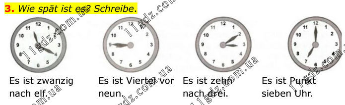 3. Wie spät ist es? Schreibe. Es ist zwanzig nach elf. Es ist Viertel vor neun. Es ist zehn nach drei. Es ist Punkt sieben Uhr.