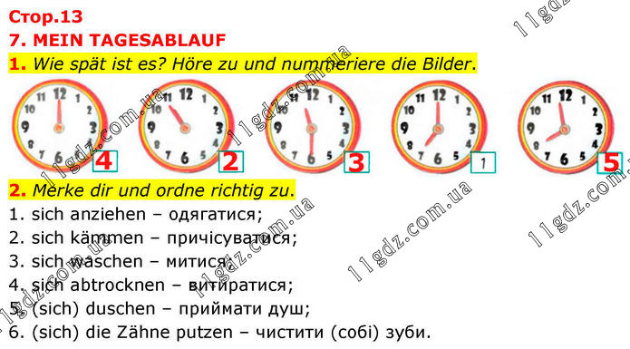 7. MEIN TAGESABLAUF 1. Wie spät ist es? Höre zu und nummeriere die Bilder. 2. Merke dir und ordne richtig zu. 1. sich anziehen – одягатися; 2. sich kämmen – причісуватися; 3. sich waschen – митися; 4. sich abtrocknen – витиратися; 5. (sich) duschen – приймати душ; 6. (sich) die Zähne putzen – чистити (собі) зуби.