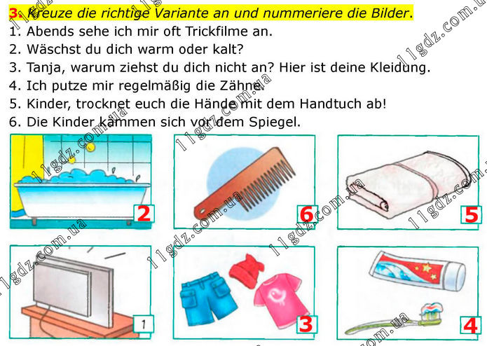 3. Kreuze die richtige Variante an und nummeriere die Bilder. 1. Abends sehe ich mir oft Trickfilme an. 2. Wäschst du dich warm oder kalt? 3. Tanja, warum ziehst du dich nicht an? Hier ist deine Kleidung. 4. Ich putze mir regelmäßig die Zähne. 5. Kinder, trocknet euch die Hände mit dem Handtuch ab! 6. Die Kinder kämmen sich vor dem Spiegel.