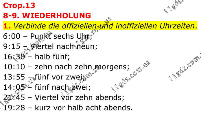 8-9. WIEDERHOLUNG 1. Verbinde die offiziellen und inoffiziellen Uhrzeiten. 6:00 – Punkt sechs Uhr; 9:15 – Viertel nach neun; 16:30 – halb fünf; 10:10 – zehn nach zehn morgens; 13:55 – fünf vor zwei; 14:05 – fünf nach zwei; 21:45 – Viertel vor zehn abends; 19:28 – kurz vor halb acht abends.