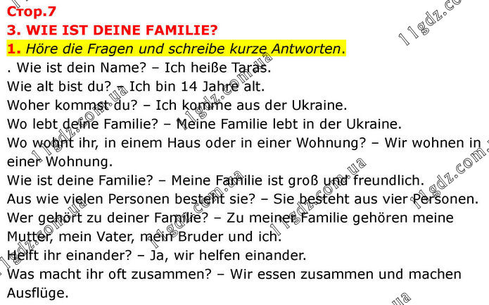 3. WIE IST DEINE FAMILIE? 1. Höre die Fragen und schreibe kurze Antworten. Wie ist dein Name? – Ich heiße Taras. Wie alt bist du? – Ich bin 14 Jahre alt. Woher kommst du? – Ich komme aus der Ukraine. Wo lebt deine Familie? – Meine Familie lebt in der Ukraine. Wo wohnt ihr, in einem Haus oder in einer Wohnung? – Wir wohnen in einer Wohnung. Wie ist deine Familie? – Meine Familie ist groß und freundlich. Aus wie vielen Personen besteht sie? – Sie besteht aus vier Personen. Wer gehört zu deiner Familie? – Zu meiner Familie gehören meine Mutter, mein Vater, mein Bruder und ich. Helft ihr einander? – Ja, wir helfen einander. Was macht ihr oft zusammen? – Wir essen zusammen und machen Ausflüge.