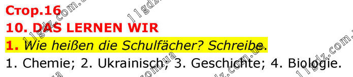 10. DAS LERNEN WIR 1. Wie heißen die Schulfächer? Schreibe. 1. Chemie; 2. Ukrainisch; 3. Geschichte; 4. Biologie.