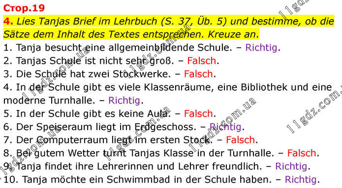 4. Lies Tanjas Brief im Lehrbuch (S. 37, Üb. 5) und bestimme, ob die Sätze dem Inhalt des Textes entsprechen. Kreuze an. 1. Tanja besucht eine allgemeinbildende Schule. – Richtig. 2. Tanjas Schule ist nicht sehr groß. – Falsch. 3. Die Schule hat zwei Stockwerke. – Falsch. 4. In der Schule gibt es viele Klassenräume, eine Bibliothek und eine moderne Turnhalle. – Richtig. 5. In der Schule gibt es keine Aula. – Falsch. 6. Der Speiseraum liegt im Erdgeschoss. – Richtig. 7. Der Computerraum liegt im ersten Stock. – Falsch. 8. Bei gutem Wetter turnt Tanjas Klasse in der Turnhalle. – Falsch. 9. Tanja findet ihre Lehrerinnen und Lehrer freundlich. – Richtig. 10. Tanja möchte ein Schwimmbad in der Schule haben. – Richtig.