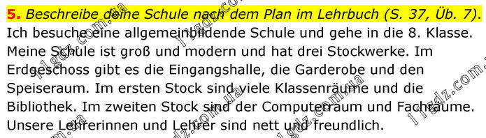 5. Beschreibe deine Schule nach dem Plan im Lehrbuch (S. 37, Üb. 7). Ich besuche eine allgemeinbildende Schule und gehe in die 8. Klasse. Meine Schule ist groß und modern und hat drei Stockwerke. Im Erdgeschoss gibt es die Eingangshalle, die Garderobe und den Speiseraum. Im ersten Stock sind viele Klassenräume und die Bibliothek. Im zweiten Stock sind der Computerraum und Fachräume. Unsere Lehrerinnen und Lehrer sind nett und freundlich.