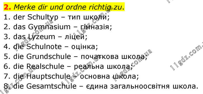 2. Merke dir und ordne richtig zu. 1. der Schultyp – тип школи; 2. das Gymnasium – гімназія; 3. das Lyzeum – ліцей; 4. die Schulnote – оцінка; 5. die Grundschule – початкова школа; 6. die Realschule – реальна школа; 7. die Hauptschule – основна школа; 8. die Gesamtschule – єдина загальноосвітня школа.