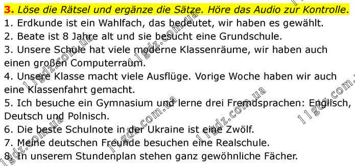 3. Löse die Rätsel und ergänze die Sätze. Höre das Audio zur Kontrolle. 1. Erdkunde ist ein Wahlfach, das bedeutet, wir haben es gewählt. 2. Beate ist 8 Jahre alt und sie besucht eine Grundschule. 3. Unsere Schule hat viele moderne Klassenräume, wir haben auch einen großen Computerraum. 4. Unsere Klasse macht viele Ausflüge. Vorige Woche haben wir auch eine Klassenfahrt gemacht. 5. Ich besuche ein Gymnasium und lerne drei Fremdsprachen: Englisch, Deutsch und Polnisch. 6. Die beste Schulnote in der Ukraine ist eine Zwölf. 7. Meine deutschen Freunde besuchen eine Realschule. 8. In unserem Stundenplan stehen ganz gewöhnliche Fächer.
