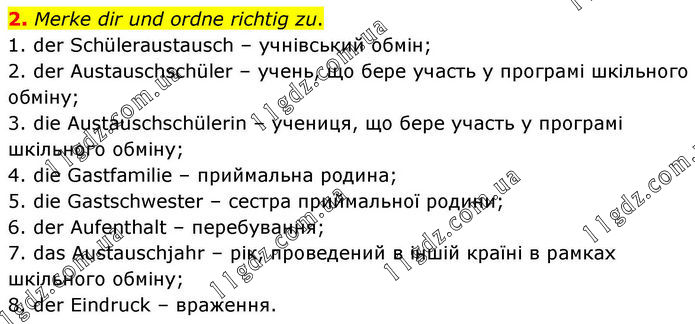 2. Merke dir und ordne richtig zu. 1. der Schüleraustausch – учнівський обмін; 2. der Austauschschüler – учень, що бере участь у програмі шкільного обміну; 3. die Austauschschülerin – учениця, що бере участь у програмі шкільного обміну; 4. die Gastfamilie – приймальна родина; 5. die Gastschwester – сестра приймальної родини; 6. der Aufenthalt – перебування; 7. das Austauschjahr – рік, проведений в іншій країні в рамках шкільного обміну; 8. der Eindruck – враження.
