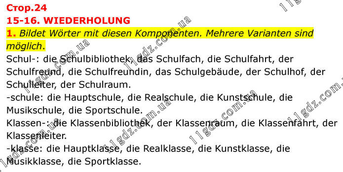15-16. WIEDERHOLUNG 1. Bildet Wörter mit diesen Komponenten. Mehrere Varianten sind möglich. Schul-: die Schulbibliothek, das Schulfach, die Schulfahrt, der Schulfreund, die Schulfreundin, das Schulgebäude, der Schulhof, der Schulleiter, der Schulraum. -schule: die Hauptschule, die Realschule, die Kunstschule, die Musikschule, die Sportschule. Klassen-: die Klassenbibliothek, der Klassenraum, die Klassenfahrt, der Klassenleiter. -klasse: die Hauptklasse, die Realklasse, die Kunstklasse, die Musikklasse, die Sportklasse.
