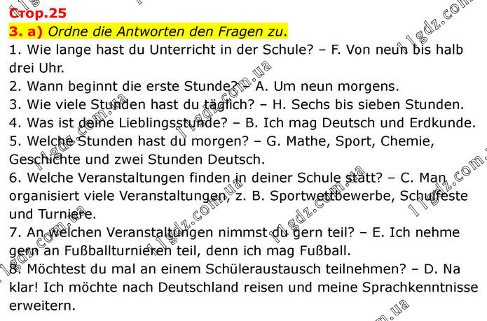 3. a) Ordne die Antworten den Fragen zu. 1. Wie lange hast du Unterricht in der Schule? – F. Von neun bis halb drei Uhr. 2. Wann beginnt die erste Stunde? – A. Um neun morgens. 3. Wie viele Stunden hast du täglich? – H. Sechs bis sieben Stunden. 4. Was ist deine Lieblingsstunde? – B. Ich mag Deutsch und Erdkunde. 5. Welche Stunden hast du morgen? – G. Mathe, Sport, Chemie, Geschichte und zwei Stunden Deutsch. 6. Welche Veranstaltungen finden in deiner Schule statt? – C. Man organisiert viele Veranstaltungen, z. B. Sportwettbewerbe, Schulfeste und Turniere. 7. An welchen Veranstaltungen nimmst du gern teil? – E. Ich nehme gern an Fußballturnieren teil, denn ich mag Fußball. 8. Möchtest du mal an einem Schüleraustausch teilnehmen? – D. Na klar! Ich möchte nach Deutschland reisen und meine Sprachkenntnisse erweitern.