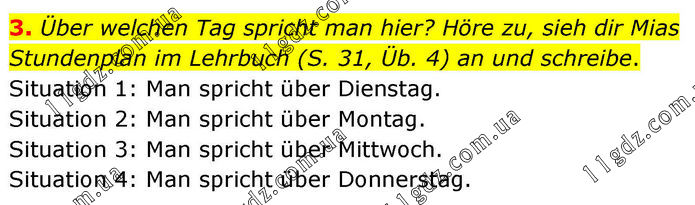 3. Über welchen Tag spricht man hier? Höre zu, sieh dir Mias Stundenplan im Lehrbuch (S. 31, Üb. 4) an und schreibe. Situation 1: Man spricht über Dienstag. Situation 2: Man spricht über Montag. Situation 3: Man spricht über Mittwoch. Situation 4: Man spricht über Donnerstag.