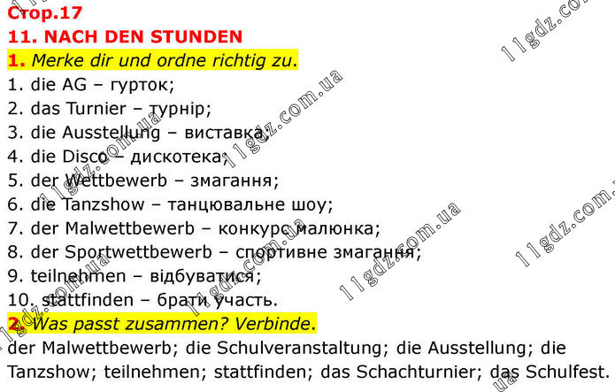 11. NACH DEN STUNDEN 1. Merke dir und ordne richtig zu. 1. die AG – гурток; 2. das Turnier – турнір; 3. die Ausstellung – виставка; 4. die Disco – дискотека; 5. der Wettbewerb – змагання; 6. die Tanzshow – танцювальне шоу; 7. der Malwettbewerb – конкурс малюнка; 8. der Sportwettbewerb – спортивне змагання; 9. teilnehmen – відбуватися; 10. stattfinden – брати участь. 2. Was passt zusammen? Verbinde. der Malwettbewerb; die Schulveranstaltung; die Ausstellung; die Tanzshow; teilnehmen; stattfinden; das Schachturnier; das Schulfest.