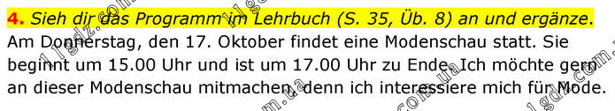 4. Sieh dir das Programm im Lehrbuch (S. 35, Üb. 8) an und ergänze. Am Donnerstag, den 17. Oktober findet eine Modenschau statt. Sie beginnt um 15.00 Uhr und ist um 17.00 Uhr zu Ende. Ich möchte gern an dieser Modenschau mitmachen, denn ich interessiere mich für Mode.