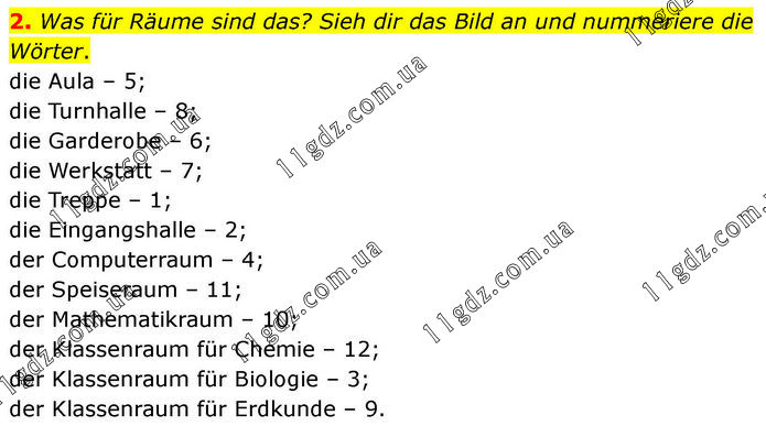 2. Was für Räume sind das? Sieh dir das Bild an und nummeriere die Wörter. die Aula – 5; die Turnhalle – 8; die Garderobe – 6; die Werkstatt – 7; die Treppe – 1; die Eingangshalle – 2; der Computerraum – 4; der Speiseraum – 11; der Mathematikraum – 10; der Klassenraum für Chemie – 12; der Klassenraum für Biologie – 3; der Klassenraum für Erdkunde – 9.