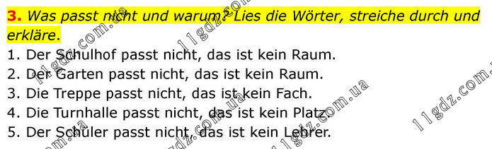3. Was passt nicht und warum? Lies die Wörter, streiche durch und erkläre. 1. Der Schulhof passt nicht, das ist kein Raum. 2. Der Garten passt nicht, das ist kein Raum. 3. Die Treppe passt nicht, das ist kein Fach. 4. Die Turnhalle passt nicht, das ist kein Platz. 5. Der Schüler passt nicht, das ist kein Lehrer.