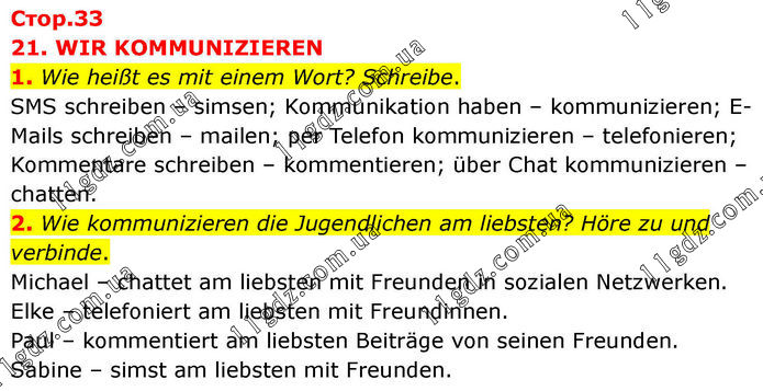 21. WIR KOMMUNIZIEREN 1. Wie heißt es mit einem Wort? Schreibe. SMS schreiben – simsen; Kommunikation haben – kommunizieren; E-Mails schreiben – mailen; per Telefon kommunizieren – telefonieren; Kommentare schreiben – kommentieren; über Chat kommunizieren – chatten. 2. Wie kommunizieren die Jugendlichen am liebsten? Höre zu und verbinde. Michael – chattet am liebsten mit Freunden in sozialen Netzwerken. Elke – telefoniert am liebsten mit Freundinnen. Paul – kommentiert am liebsten Beiträge von seinen Freunden. Sabine – simst am liebsten mit Freunden.