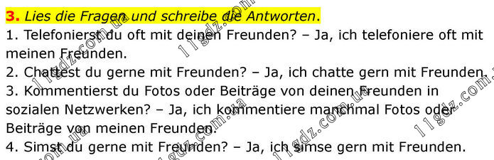 3. Lies die Fragen und schreibe die Antworten. 1. Telefonierst du oft mit deinen Freunden? – Ja, ich telefoniere oft mit meinen Freunden. 2. Chattest du gerne mit Freunden? – Ja, ich chatte gern mit Freunden. 3. Kommentierst du Fotos oder Beiträge von deinen Freunden in sozialen Netzwerken? – Ja, ich kommentiere manchmal Fotos oder Beiträge von meinen Freunden. 4. Simst du gerne mit Freunden? – Ja, ich simse gern mit Freunden.