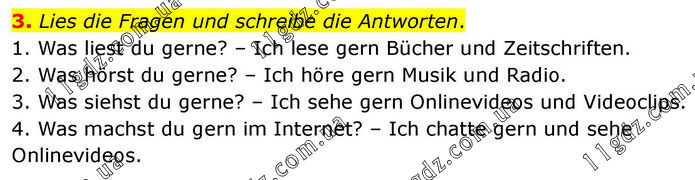 3. Lies die Fragen und schreibe die Antworten. 1. Was liest du gerne? – Ich lese gern Bücher und Zeitschriften. 2. Was hörst du gerne? – Ich höre gern Musik und Radio. 3. Was siehst du gerne? – Ich sehe gern Onlinevideos und Videoclips. 4. Was machst du gern im Internet? – Ich chatte gern und sehe Onlinevideos.