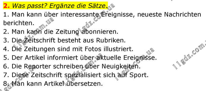 2. Was passt? Ergänze die Sätze. 1. Man kann über interessante Ereignisse, neueste Nachrichten berichten. 2. Man kann die Zeitung abonnieren. 3. Die Zeitschrift besteht aus Rubriken. 4. Die Zeitungen sind mit Fotos illustriert. 5. Der Artikel informiert über aktuelle Ereignisse. 6. Die Reporter schreiben über Neuigkeiten. 7. Diese Zeitschrift spezialisiert sich auf Sport. 8. Man kann Artikel übersetzen.