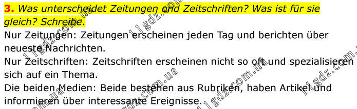 3. Was unterscheidet Zeitungen und Zeitschriften? Was ist für sie gleich? Schreibe. Nur Zeitungen: Zeitungen erscheinen jeden Tag und berichten über neueste Nachrichten. Nur Zeitschriften: Zeitschriften erscheinen nicht so oft und spezialisieren sich auf ein Thema. Die beiden Medien: Beide bestehen aus Rubriken, haben Artikel und informieren über interessante Ereignisse.