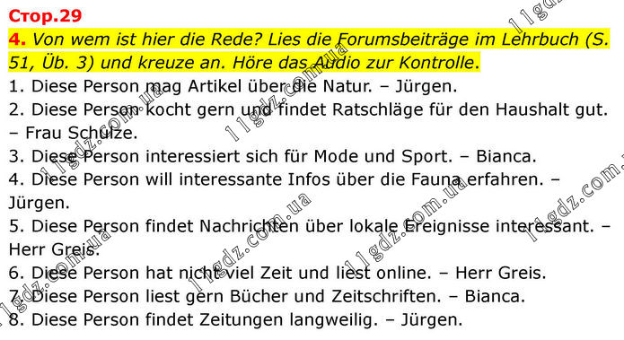 4. Von wem ist hier die Rede? Lies die Forumsbeiträge im Lehrbuch (S. 51, Üb. 3) und kreuze an. Höre das Audio zur Kontrolle. 1. Diese Person mag Artikel über die Natur. – Jürgen. 2. Diese Person kocht gern und findet Ratschläge für den Haushalt gut. – Frau Schulze. 3. Diese Person interessiert sich für Mode und Sport. – Bianca. 4. Diese Person will interessante Infos über die Fauna erfahren. – Jürgen. 5. Diese Person findet Nachrichten über lokale Ereignisse interessant. – Herr Greis. 6. Diese Person hat nicht viel Zeit und liest online. – Herr Greis. 7. Diese Person liest gern Bücher und Zeitschriften. – Bianca. 8. Diese Person findet Zeitungen langweilig. – Jürgen.