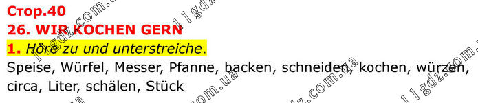 26. WIR KOCHEN GERN 1. Höre zu und unterstreiche. Speise, Würfel, Messer, Pfanne, backen, schneiden, kochen, würzen, circa, Liter, schälen, Stück.