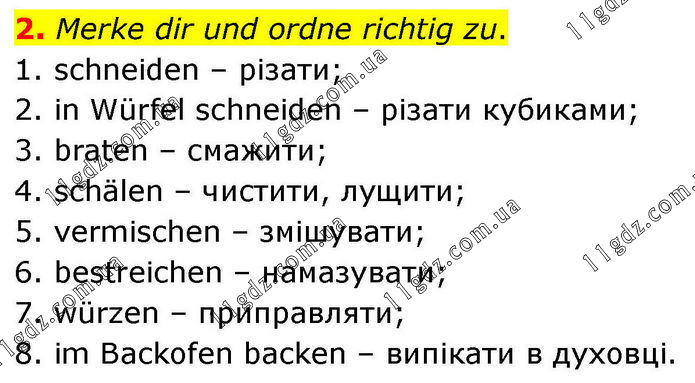 2. Merke dir und ordne richtig zu. 1. schneiden – різати; 2. in Würfel schneiden – різати кубиками; 3. braten – смажити; 4. schälen – чистити, лущити; 5. vermischen – змішувати; 6. bestreichen – намазувати; 7. würzen – приправляти; 8. im Backofen backen – випікати в духовці.