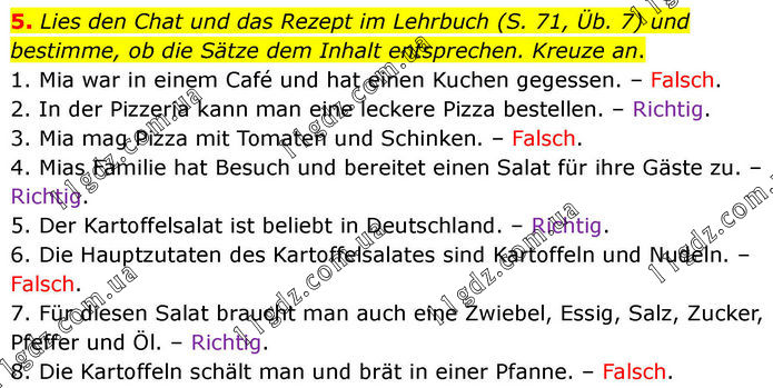 5. Lies den Chat und das Rezept im Lehrbuch (S. 71, Üb. 7) und bestimme, ob die Sätze dem Inhalt entsprechen. Kreuze an. 1. Mia war in einem Café und hat einen Kuchen gegessen. – Falsch. 2. In der Pizzeria kann man eine leckere Pizza bestellen. – Richtig. 3. Mia mag Pizza mit Tomaten und Schinken. – Falsch. 4. Mias Familie hat Besuch und bereitet einen Salat für ihre Gäste zu. – Richtig. 5. Der Kartoffelsalat ist beliebt in Deutschland. – Richtig. 6. Die Hauptzutaten des Kartoffelsalates sind Kartoffeln und Nudeln. – Falsch. 7. Für diesen Salat braucht man auch eine Zwiebel, Essig, Salz, Zucker, Pfeffer und Öl. – Richtig. 8. Die Kartoffeln schält man und brät in einer Pfanne. – Falsch.