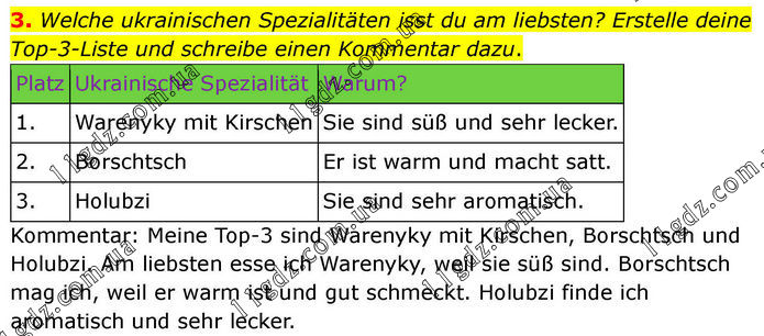 3. Welche ukrainischen Spezialitäten isst du am liebsten? Erstelle deine Top-3-Liste und schreibe einen Kommentar dazu. Kommentar: Meine Top-3 sind Warenyky mit Kirschen, Borschtsch und Holubzi. Am liebsten esse ich Warenyky, weil sie süß sind. Borschtsch mag ich, weil er warm ist und gut schmeckt. Holubzi finde ich aromatisch und sehr lecker.