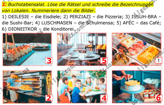 2. Buchstabensalat. Löse die Rätsel und schreibe die Bezeichnungen von Lokalen. Nummeriere dann die Bilder. 1) DEILESIE – die Eisdiele; 2) PERZIAZI – die Pizzeria; 3) ISSUH-BRA – die Sushi-Bar; 4) LUSCHMASEN – die Schulmensa; 5) AFÉC – das Café; 6) DIONEITKOR – die Konditorei.