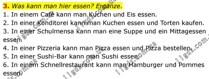 3. Was kann man hier essen? Ergänze. 1. In einem Café kann man Kuchen und Eis essen. 2. In einer Konditorei kann man Kuchen essen und Torten kaufen. 3. In einer Schulmensa kann man eine Suppe und ein Mittagessen essen. 4. In einer Pizzeria kann man Pizza essen und Pizza bestellen. 5. In einer Sushi-Bar kann man Sushi essen. 6. In einem Schnellrestaurant kann man Hamburger und Pommes essen.