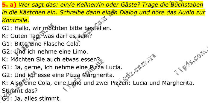 5. a) Wer sagt das: ein/e Kellner/in oder Gäste? Trage die Buchstaben in die Kästchen ein. Schreibe dann einen Dialog und höre das Audio zur Kontrolle. G1: Hallo, wir möchten bitte bestellen. K: Guten Tag, was darf es sein? G1: Bitte eine Flasche Cola. G2: Und ich nehme eine Limo. K: Möchten Sie auch etwas essen? G1: Ja, gerne, ich nehme eine Pizza Lucia. G2: Und ich esse eine Pizza Margherita. K: Also eine Cola, eine Limo und zwei Pizzen: Lucia und Margherita. Stimmt das? G1: Ja, alles stimmt.