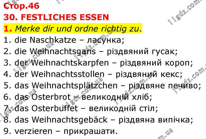 30. FESTLICHES ESSEN 1. Merke dir und ordne richtig zu. 1. die Naschkatze – ласунка; 2. die Weihnachtsgans – різдвяний гусак; 3. der Weihnachtskarpfen – різдвяний короп; 4. der Weihnachtsstollen – різдвяний кекс; 5. das Weihnachtsplätzchen – різдвяне печиво; 6. das Osterbrot – великодній хліб; 7. das Osterbuffet – великодній стіл; 8. das Weihnachtsgebäck – різдвяна випічка; 9. verzieren – прикрашати.