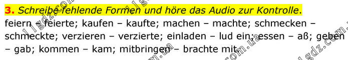 3. Schreibe fehlende Formen und höre das Audio zur Kontrolle. feiern – feierte; kaufen – kaufte; machen – machte; schmecken – schmeckte; verzieren – verzierte; einladen – lud ein; essen – aß; geben – gab; kommen – kam; mitbringen – brachte mit.