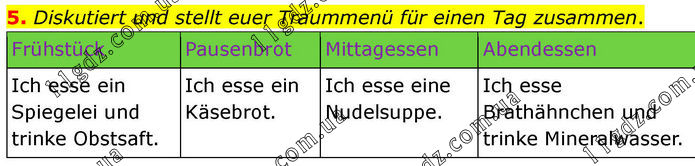 5. Diskutiert und stellt euer Traummenü für einen Tag zusammen. Frühstück Pausenbrot Mittagessen Abendessen Ich esse ein Spiegelei und trinke Obstsaft. Ich esse ein Käsebrot. Ich esse eine Nudelsuppe. Ich esse Brathähnchen und trinke Mineralwasser.