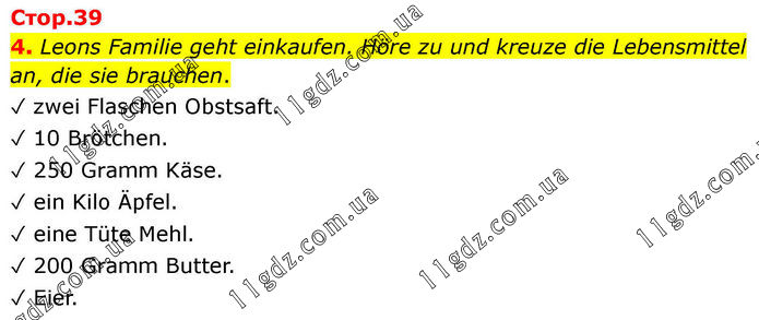 4. Leons Familie geht einkaufen. Höre zu und kreuze die Lebensmittel an, die sie brauchen. ✓ zwei Flaschen Obstsaft. ✓ 10 Brötchen. ✓ 250 Gramm Käse. ✓ ein Kilo Äpfel. ✓ eine Tüte Mehl. ✓ 200 Gramm Butter. ✓ Eier.