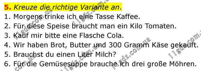 5. Kreuze die richtige Variante an. 1. Morgens trinke ich eine Tasse Kaffee. 2. Für diese Speise braucht man ein Kilo Tomaten. 3. Kauf mir bitte eine Flasche Cola. 4. Wir haben Brot, Butter und 300 Gramm Käse gekauft. 5. Brauchst du einen Liter Milch? 6. Für die Gemüsesuppe brauche ich drei große Möhren.