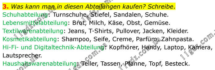 3. Was kann man in diesen Abteilungen kaufen? Schreibe. Schuhabteilung: Turnschuhe, Stiefel, Sandalen, Schuhe. Lebensmittelabteilung: Brot, Milch, Käse, Obst, Gemüse. Textilwarenabteilung: Jeans, T-Shirts, Pullover, Jacken, Kleider. Kosmetikabteilung: Shampoo, Seife, Creme, Parfüm, Zahnpasta. Hi-Fi- und Digitaltechnik-Abteilung: Kopfhörer, Handy, Laptop, Kamera, Lautsprecher. Haushaltswarenabteilung: Teller, Tassen, Pfanne, Topf, Besteck.