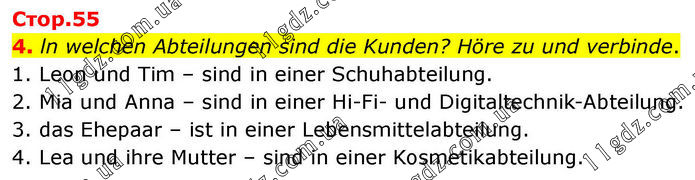 4. ln welchen Abteilungen sind die Kunden? Höre zu und verbinde. 1. Leon und Tim – sind in einer Schuhabteilung. 2. Mia und Anna – sind in einer Hi-Fi- und Digitaltechnik-Abteilung. 3. das Ehepaar – ist in einer Lebensmittelabteilung. 4. Lea und ihre Mutter – sind in einer Kosmetikabteilung.