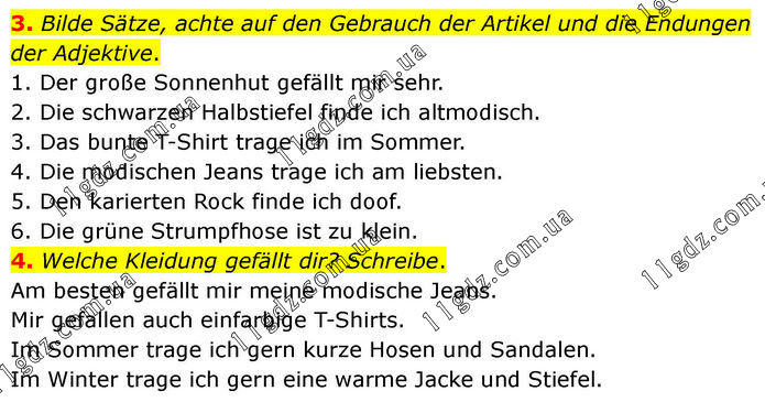 3. Bilde Sätze, achte auf den Gebrauch der Artikel und die Endungen der Adjektive. 1. Der große Sonnenhut gefällt mir sehr. 2. Die schwarzen Halbstiefel finde ich altmodisch. 3. Das bunte T-Shirt trage ich im Sommer. 4. Die modischen Jeans trage ich am liebsten. 5. Den karierten Rock finde ich doof. 6. Die grüne Strumpfhose ist zu klein. 4. Welche Kleidung gefällt dir? Schreibe. Am besten gefällt mir meine modische Jeans. Mir gefallen auch einfarbige T-Shirts. Im Sommer trage ich gern kurze Hosen und Sandalen. Im Winter trage ich gern eine warme Jacke und Stiefel.
