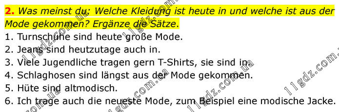 2. Was meinst du: Welche Kleidung ist heute in und welche ist aus der Mode gekommen? Ergänze die Sätze. 1. Turnschuhe sind heute große Mode. 2. Jeans sind heutzutage auch in. 3. Viele Jugendliche tragen gern T-Shirts, sie sind in. 4. Schlaghosen sind längst aus der Mode gekommen. 5. Hüte sind altmodisch. 6. Ich trage auch die neueste Mode, zum Beispiel eine modische Jacke.