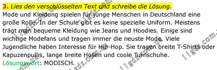 3. Lies den verschlüsselten Text und schreibe die Lösung. Mode und Kleidung spielen für junge Menschen in Deutschland eine große Rolle. In der Schule gibt es keine spezielle Uniform. Meistens trägt man bequeme Kleidung wie Jeans und Hoodies. Einige sind wichtige Modefans und tragen immer die neuste Mode. Viele Jugendliche haben Interesse für Hip-Hop. Sie tragen breite T-Shirts oder Kapuzenpullis, lange breite Hosen und coole Turnschuhe. Lösungswort: MODISCH.