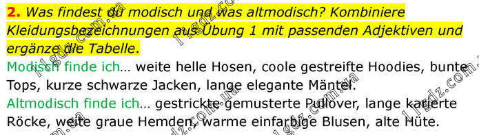 2. Was findest du modisch und was altmodisch? Kombiniere Kleidungsbezeichnungen aus Übung 1 mit passenden Adjektiven und ergänze die Tabelle. Modisch finde ich… weite helle Hosen, coole gestreifte Hoodies, bunte Tops, kurze schwarze Jacken, lange elegante Mäntel. Altmodisch finde ich… gestrickte gemusterte Pullover, lange karierte Röcke, weite graue Hemden, warme einfarbige Blusen, alte Hüte.