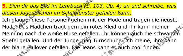 5. Sieh dir das Bild im Lehrbuch (S. 103, Üb. 4) an und schreibe, was diesen Jugendlichen im Schaufenster gefallen kann. Ich glaube, diese Personen gehen mit der Mode und tragen die neuste Mode. Das Mädchen trägt gern ein rotes Kleid und ihr kann meiner Meinung nach die weiße Bluse gefallen. Ihr können auch die schwarzen Stiefel gefallen. Und der Junge mag Turnschuhe. Ich meine, ihm kann der blaue Pullover gefallen. Die Jeans kann er auch cool finden.