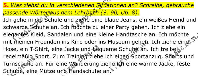 5. Was ziehst du in verschiedenen Situationen an? Schreibe, gebrauche passende Wörter aus dem Lehrbuch (S. 90, Üb. 8). Ich gehe in die Schule und ziehe eine blaue Jeans, ein weißes Hemd und schwarze Schuhe an. Ich möchte zu einer Party gehen. Ich ziehe ein elegantes Kleid, Sandalen und eine kleine Handtasche an. Ich möchte mit meinen Freunden ins Kino oder ins Museum gehen. Ich ziehe eine Hose, ein T-Shirt, eine Jacke und bequeme Schuhe an. Ich treibe regelmäßig Sport. Zum Training ziehe ich einen Sportanzug, Shorts und Turnschuhe an. Für eine Wanderung ziehe ich eine warme Jacke, feste Schuhe, eine Mütze und Handschuhe an.
