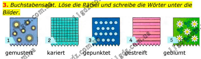 3. Buchstabensalat. Löse die Rätsel und schreibe die Wörter unter die Bilder. gemustert kariert gepunktet gestreift geblümt