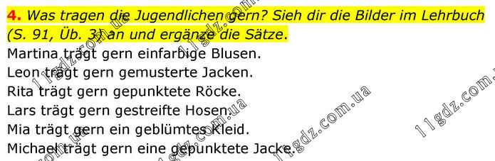 4. Was tragen die Jugendlichen gern? Sieh dir die Bilder im Lehrbuch (S. 91, Üb. 3) an und ergänze die Sätze. Martina trägt gern einfarbige Blusen. Leon trägt gern gemusterte Jacken. Rita trägt gern gepunktete Röcke. Lars trägt gern gestreifte Hosen. Mia trägt gern ein geblümtes Kleid. Michael trägt gern eine gepunktete Jacke.
