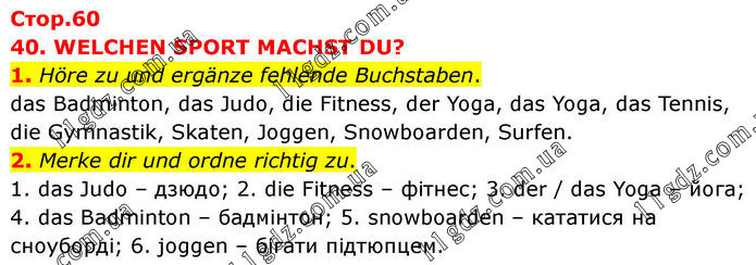 40. WELCHEN SPORT MACHST DU? 1. Höre zu und ergänze fehlende Buchstaben. das Badminton, das Judo, die Fitness, der Yoga, das Yoga, das Tennis, die Gymnastik, Skaten, Joggen, Snowboarden, Surfen. 2. Merke dir und ordne richtig zu. 1. das Judo – дзюдо; 2. die Fitness – фітнес; 3. der / das Yoga – йога; 4. das Badminton – бадмінтон; 5. snowboarden – кататися на сноуборді; 6. joggen – бігати підтюпцем.