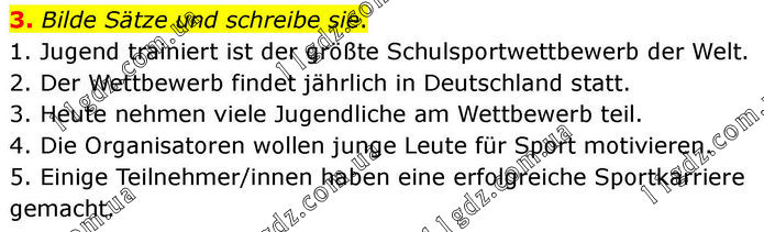 3. Bilde Sätze und schreibe sie. 1. Jugend trainiert ist der größte Schulsportwettbewerb der Welt. 2. Der Wettbewerb findet jährlich in Deutschland statt. 3. Heute nehmen viele Jugendliche am Wettbewerb teil. 4. Die Organisatoren wollen junge Leute für Sport motivieren. 5. Einige Teilnehmer/innen haben eine erfolgreiche Sportkarriere gemacht.