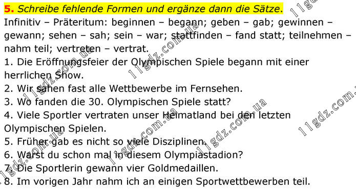5. Schreibe fehlende Formen und ergänze dann die Sätze. Infinitiv – Präteritum: beginnen – begann; geben – gab; gewinnen – gewann; sehen – sah; sein – war; stattfinden – fand statt; teilnehmen – nahm teil; vertreten – vertrat. 1. Die Eröffnungsfeier der Olympischen Spiele begann mit einer herrlichen Show. 2. Wir sahen fast alle Wettbewerbe im Fernsehen. 3. Wo fanden die 30. Olympischen Spiele statt? 4. Viele Sportler vertraten unser Heimatland bei den letzten Olympischen Spielen. 5. Früher gab es nicht so viele Disziplinen. 6. Warst du schon mal in diesem Olympiastadion? 7. Die Sportlerin gewann vier Goldmedaillen. 8. Im vorigen Jahr nahm ich an einigen Sportwettbewerben teil.