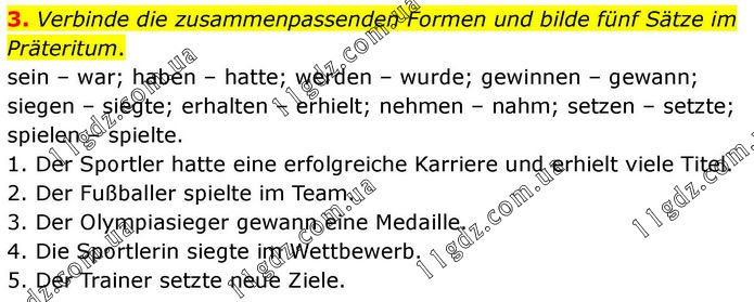 3. Verbinde die zusammenpassenden Formen und bilde fünf Sätze im Präteritum. sein – war; haben – hatte; werden – wurde; gewinnen – gewann; siegen – siegte; erhalten – erhielt; nehmen – nahm; setzen – setzte; spielen – spielte. 1. Der Sportler hatte eine erfolgreiche Karriere und erhielt viele Titel. 2. Der Fußballer spielte im Team. 3. Der Olympiasieger gewann eine Medaille. 4. Die Sportlerin siegte im Wettbewerb. 5. Der Trainer setzte neue Ziele.